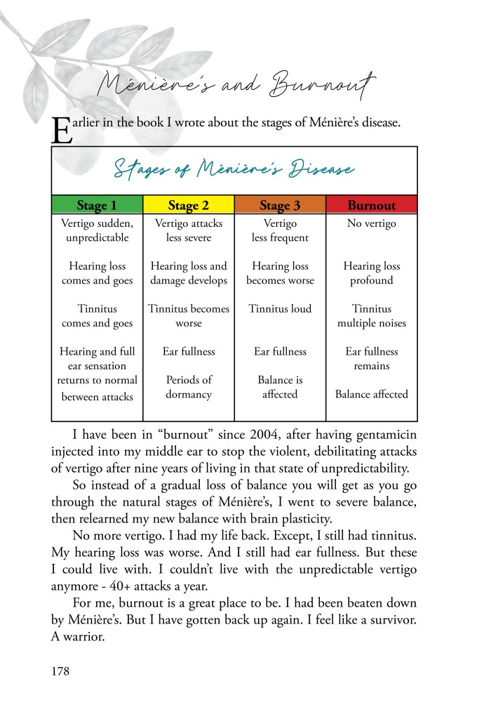 Profits from the eBook and Print book will be donated to Ménière’s research, as all of my Ménière’s books are. I don’t publish Ménière’s books for personal gain, but to help others.