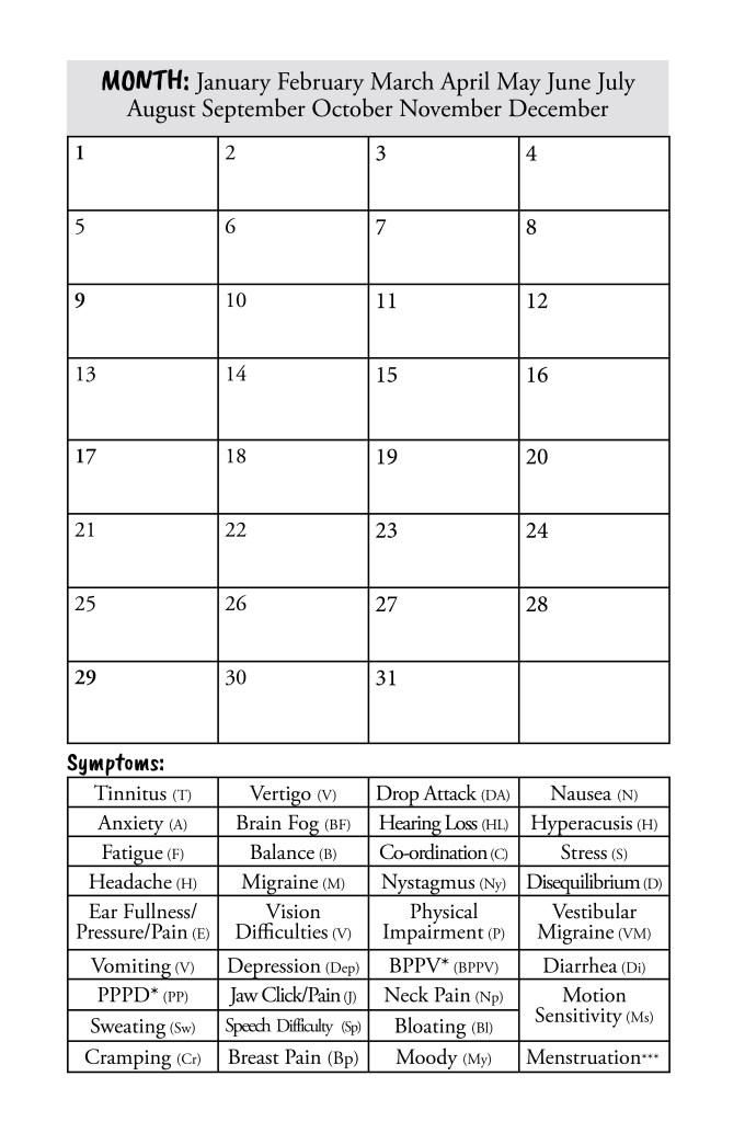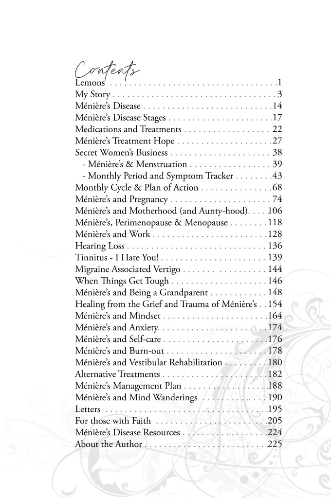 On the pages you’ll find tips, hints, research, personal anecdotes, secret women’s business, pregnancy, motherhood, grand-motherhood, understanding, inspiration and mindset, self-care, a period and Meniere’s symptoms tracker and a Ménière’s Management Plan, plus lots more.